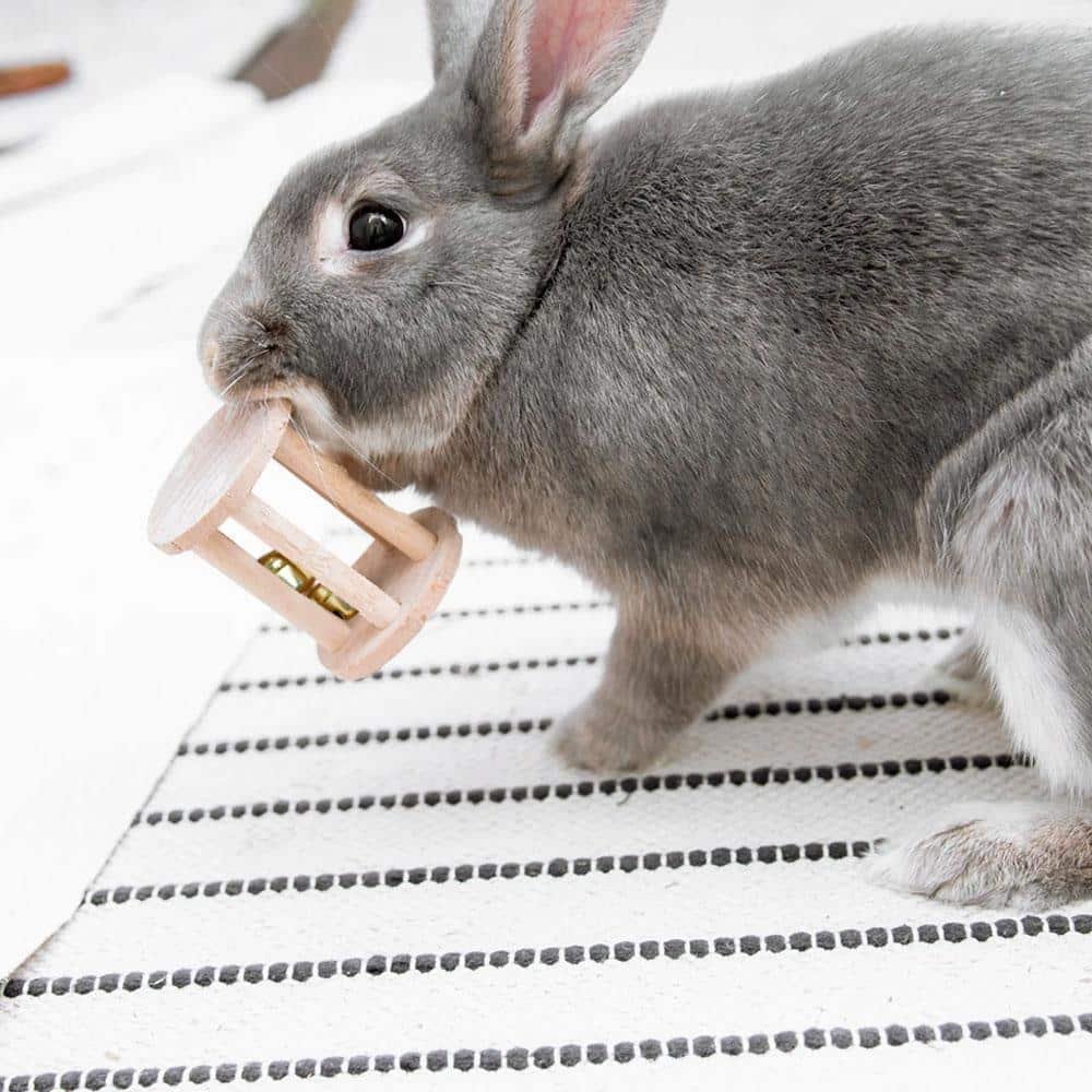 Rabbits left with nothing to do will find something to do, and that usually means your baseboards, cables, or favorite chair legs. A solid rabbit chew toy redirects that energy toward something safe. The built-in bells add a layer of sound enrichment that triggers curiosity, so your bun keeps coming back to shake and nudge it around. Think of wooden rabbit toys like this one as part of a rotation, swap them in and out alongside other enrichment items to keep things fresh in your rabbit’s space.
